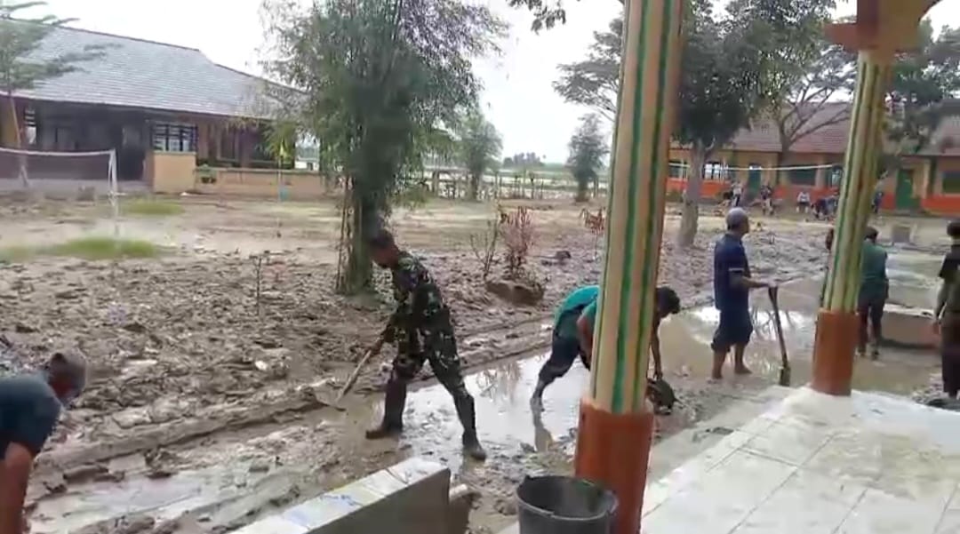 Dengan alat seadanya seperti sekop, cangkul, dan ember, para prajurit tak kenal lelah membersihkan halaman, mushalla, dan ruang kelas yang tertimbun endapan lumpur tebal. Setiap sapuan tangan mereka adalah wujud kepedulian terhadap fasilitas pendidikan yang menjadi harapan generasi muda. Aksi ini menjadi simbol nyata kemanunggalan TNI dengan rakyat.