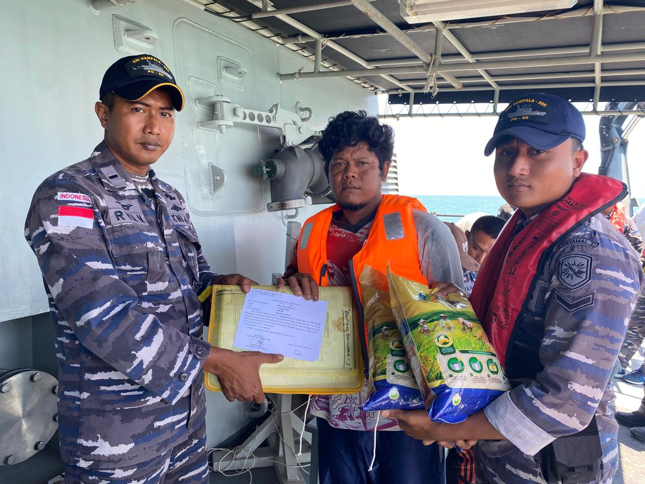Selanjutnya, prajurit KRI Hampala-880 membagikan bantuan berupa beras dan obat-obatan secara langsung di atas kapal nelayan.
