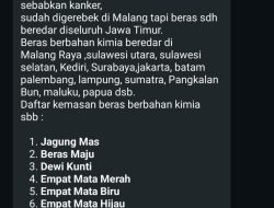 Malang, Barometer99.com – Pesan berantai soal penggerebekan produsen beras “UD Widodo” di Bululawang, Kabupaten Malnag, kembali viral di WhatsApp. Narasi panjang yang memuat klaim “beras dicuci bahan kimia pemutih”, daftar merek beras berbahaya, hingga imbauan agar masyarakat melapor ke Satgas Pangan itu kembali menyebar dan menimbulkan keresahan.