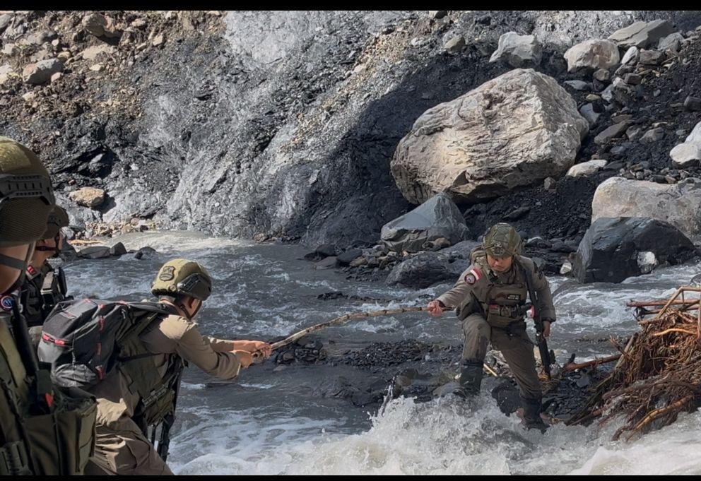 Di lapangan, personel terlihat saling membantu saat menyeberangi sungai dengan arus deras serta bergerak hati-hati di jalur berbatu. Kekompakan dan kesiapsiagaan tersebut menjadi bagian penting dalam memastikan patroli berjalan aman dan efektif.