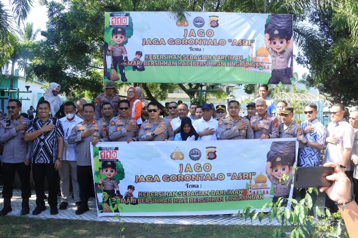 Gorontalo, Barometer99.com – Polda Gorontalo menggelar Program Gerakan Nasional Indonesia Asri (Aman, Sehat, Resik dan Indah) melalui aksi pembersihan bertajuk JAGO ASRI (Jaga Gorontalo, Aman, Sehat, Resik, Indah) dengan tema “Kebersihan Sebagian Dari Iman, Mari Bersihkan Hati Bersihkan Lingkungan”. Kegiatan tersebut dipimpin langsung oleh Kapolda Gorontalo, Irjen Pol. Drs. Widodo, S.H., M.H..