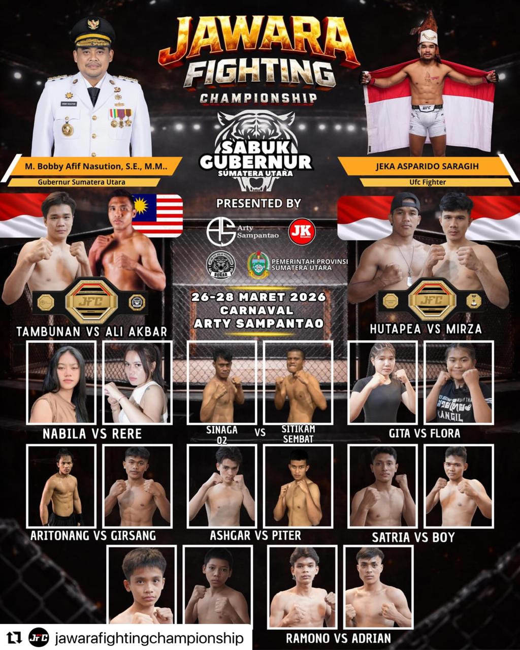 Medan, Barometer99.com – 24 Maret 2026 Jawara Fighting Championship (JFC) Season 2, yang diselenggarakan oleh saudara kita Jeka Saragih (BONAR SIMALUNGUN), siap menghadirkan laga seru antara petarung Indonesia dan Malaysia pada tanggal 26 hingga 28 Maret 2026 di Carnaval Arty Sampantao di Stadion Kota Perdagangan Kabupaten Simalungun . Acara ini tidak hanya menjadi ajang kompetisi olahraga bela diri kelas dunia, tetapi juga sebagai bukti nyata dari komitmen untuk mengangkat progres olahraga di Sumatera Utara.