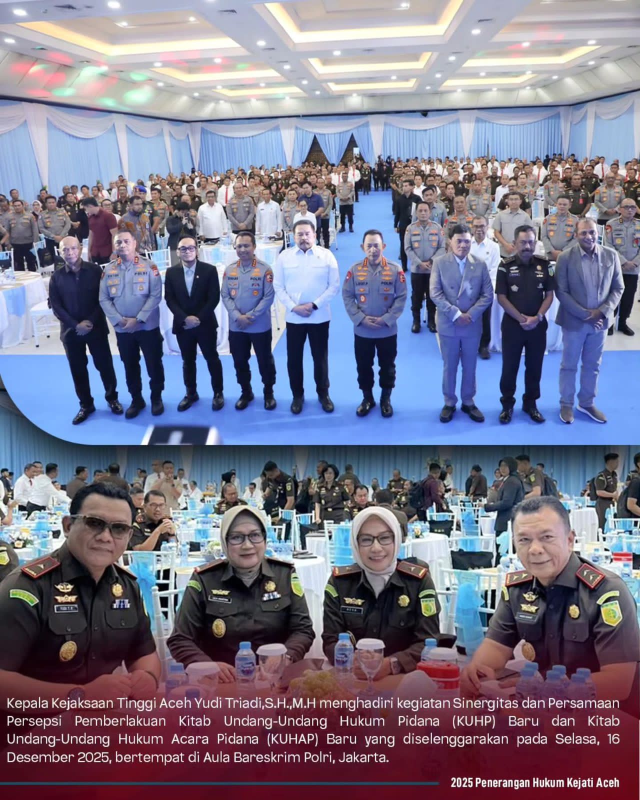 Jakarta, Barometer99.com – Kepala Kejaksaan Tinggi Aceh Yudi Triadi,S.H.,M.H menghadiri kegiatan Sinergitas dan Persamaan Persepsi Pemberlakuan Kitab Undang-Undang Hukum Pidana (KUHP) Baru dan Kitab Undang-Undang Hukum Acara Pidana (KUHAP) Baru yang diselenggarakan pada Selasa, 16 Desember 2025, bertempat di Aula Bareskrim Polri, Jakarta.