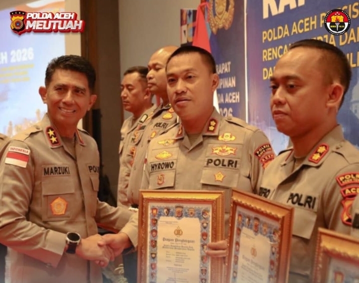 Aceh Besar, Barometer99.com – Kapolda Aceh Marzuki Ali Basyah, dalam rangkaian kegiatan Rapat Pimpinan (Rapim) Polda Aceh 2026, memberikan penghargaan kepada personel Polri, mahasiswa STIK Lemdiklat Polri, serta elemen masyarakat yang berkontribusi signifikan dalam penanganan bencana di Provinsi Aceh.