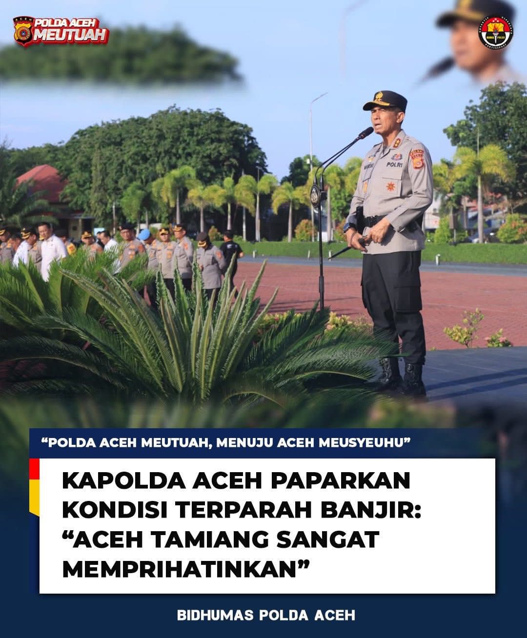 “Sebanyak 18 Kabupaten/Kota terdampak banjir. Namun, Kabupaten Aceh Tamiang merupakan wilayah yang paling parah dan sangat memprihatinkan kondisinya,” ujar Kapolda saat memimpin apel pagi di Mapolda Aceh, Sabtu, 6 Desember 2025.