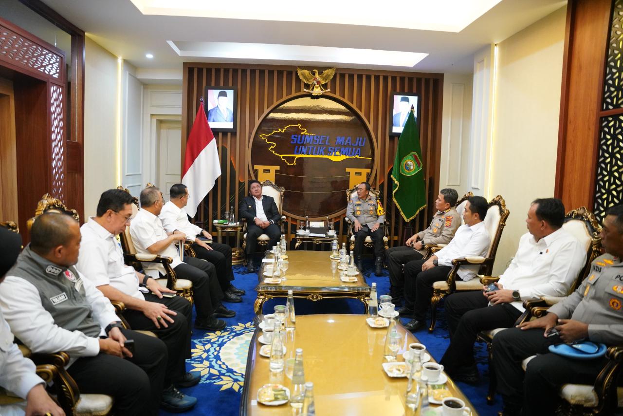 Gubernur Sumatera Selatan Dr. H. Herman Deru, S.H., M.H. menerima langsung Kapolda Sumsel bersama pejabat utama Polda Sumsel. Dalam pertemuan tersebut, kedua pihak membahas penguatan koordinasi lintas sektor guna menjaga stabilitas keamanan dan ketertiban masyarakat (kamtibmas) serta mendukung percepatan pembangunan daerah.