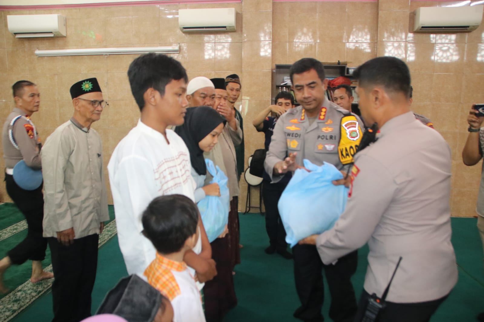 Dengan penuh kehangatan, Kapolres menyerahkan bantuan secara langsung, disambut senyum tulus dari para penerima dan jamaah yang hadir.
