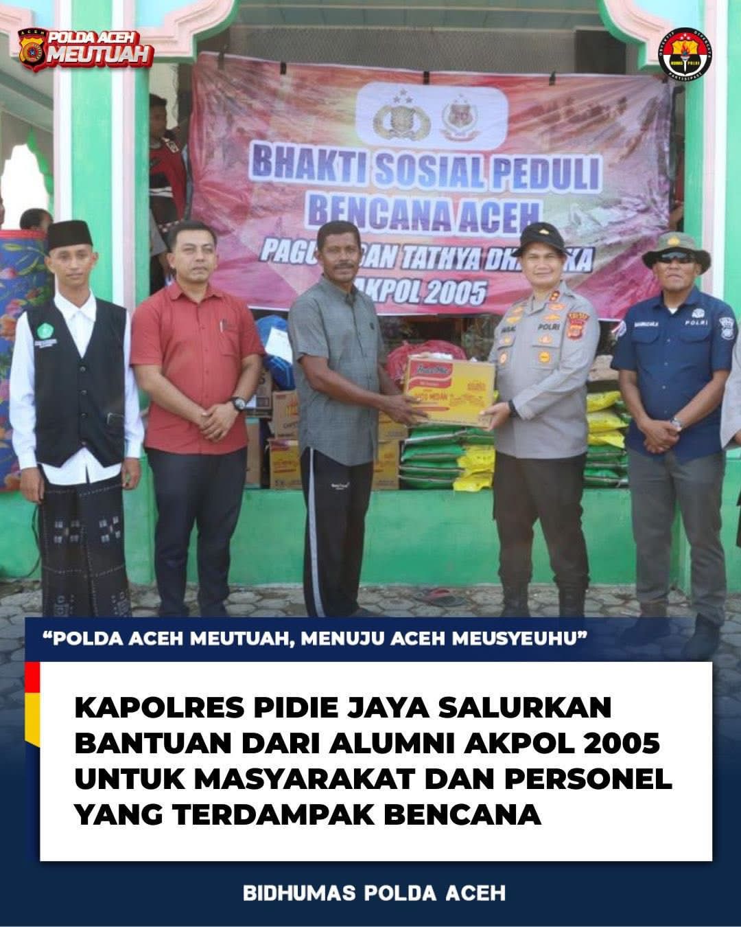Bantuan tersebut diberikan sebagai bentuk kepedulian dan solidaritas alumni Akpol 2005 serta Polres Pidie Jaya kepada warga yang sedang mengalami kesulitan pascabencana banjir bandang yang melanda wilayah tersebut.