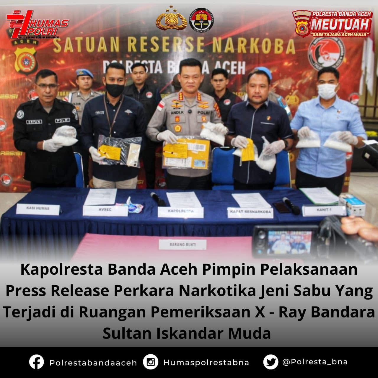 Aceh, Barometer99.com – Kapolresta Banda Aceh telah memimpin pelaksanaan press release terkait perkara narkotika jenis sabu, yang ditemukan di ruangan pemeriksaan X-Ray Bandara Sultan Iskandar Muda. Kegiatan ini menjadi bagian dari upaya kepolisian dalam menegakkan hukum serta memberikan transparansi terkait penindakan kasus narkoba di wilayahnya.