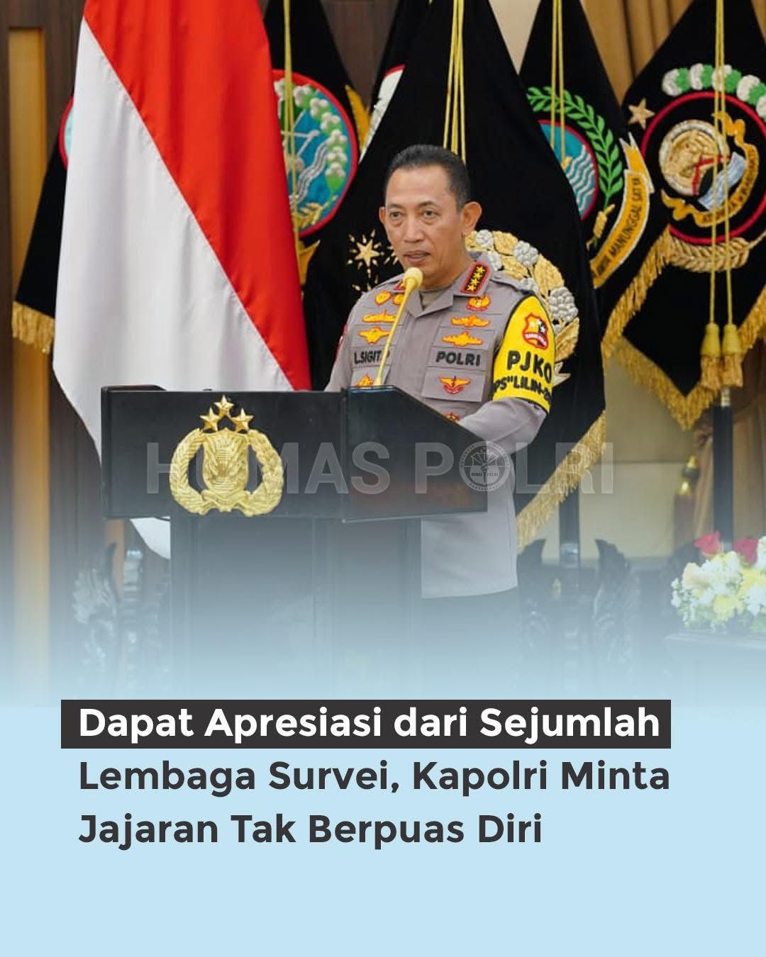 Kapolri mengungkapkan bahwa Polri juga menempati peringkat pertama sebagai lembaga penegak hukum paling dipercaya dengan tingkat kepercayaan 78,2 persen. “Hasil penilaian dari lembaga survei riset internasional dan survei nasional tersebut, tentunya saya minta agar seluruh jajaran menyikapinya dengan rasa untuk tidak berpuas diri. Namun harus terus melakukan perbaikan dan evaluasi, secara berkelanjutan untuk meningkatkan kinerja institusi,” ujar Kapolri.