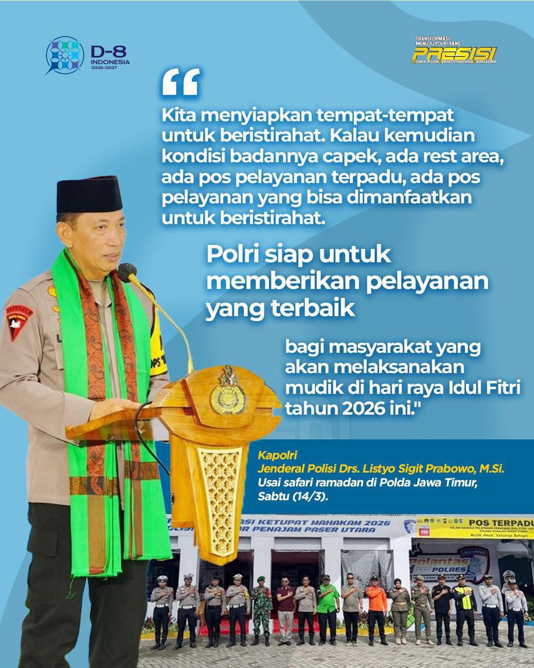 Kapolri menyampaikan bahwa berbagai langkah telah disiapkan guna memastikan perjalanan masyarakat menuju kampung halaman dapat berlangsung aman, lancar, dan nyaman. Polri bersama instansi terkait telah menyiapkan berbagai fasilitas pendukung bagi para pemudik di sejumlah jalur utama.
