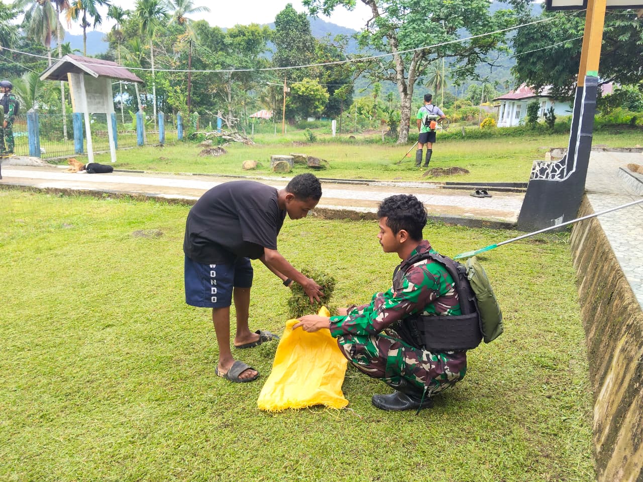 Satgas Yonif 410 Alugoro, Pos Teluk Etna, sedang melaksanakan kegiatan Karya Bakti (Karbak) di Masjid Miftahul Jannah, Distrik Teluk Etna, Papua Barat. Kegiatan ini bertujuan untuk membantu membersihkan dan memelihara fasilitas umum, khususnya tempat ibadah.