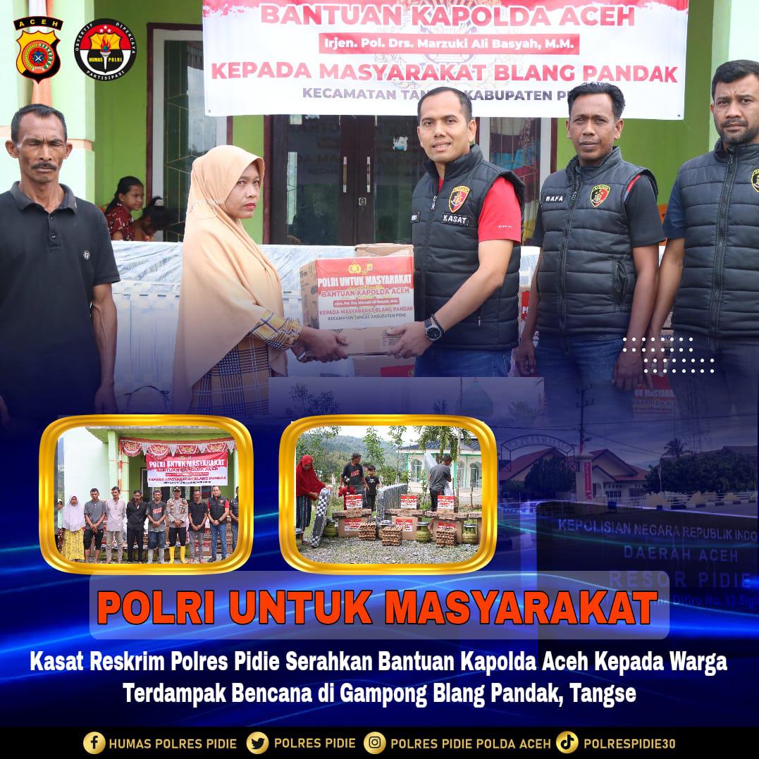 Kapolres Pidie AKBP Jaka Mulyana, SIK, MIK Kasat Reskrim AKP Dedy Miswar, S.Sos, MH menyampaikan bahwa bantuan tersebut diharapkan dapat membantu memenuhi kebutuhan dasar warga serta meringankan beban masyarakat pasca bencana di Gampong Blang Pandak Tangse.