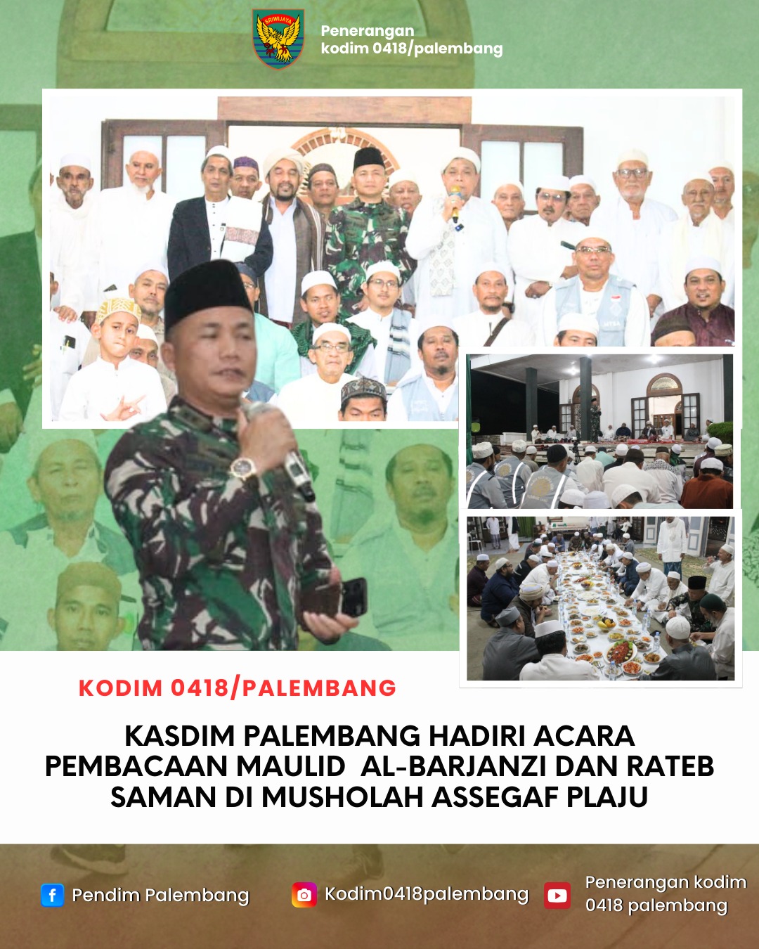 Palembang, Barometer99.com – Dandim 0418/Palembang yang diwakili Kasdim Letkol Inf Dery Septriandi, S.T., M.M., M.Han menghadiri undangan Majelis Dzikir kegiatan pembacaan Maulid Al-Barzanji dan Rateb Saman yang digelar di Musholah Assegaf, Jalan D.I. Panjaitan 16 Ulu, Komplek Assegaf, Kecamatan Plaju, Selasa malam Rabu (17/02/2026)