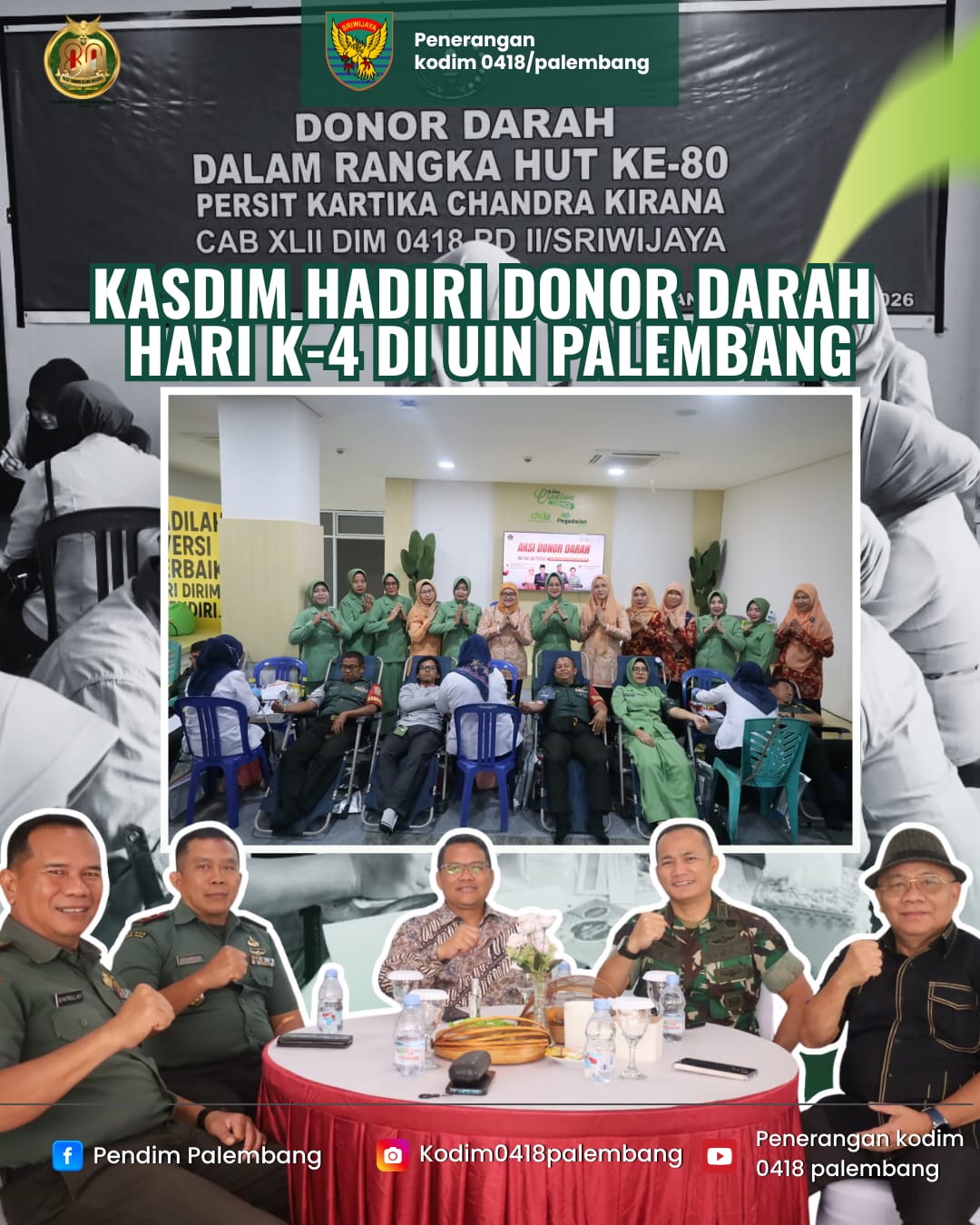 Palembang, Barometer99.com – Kasdim 0418/Palembang Letkol Inf Dery Septriandi, S.T., M.M., M.Han mewakili Dandim 0418/Palembang memimpin langsung kegiatan donor darah dalam rangka memperingati Hari Ulang Tahun (HUT) ke-80 Persit Kartika Chandra Kirana Tahun 2026 yang digelar di Kantor Rektorat UIN Raden Patah Kampus B, Jalan Pangeran Ratu, 15 Ulu, Kecamatan Seberang Ulu I, Rabu (28/01/2026).