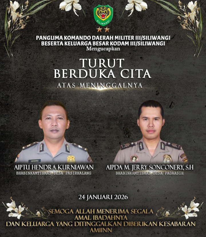 Pangdam III/Siliwangi menyampaikan ungkapan belasungkawa yang mendalam serta rasa hormat setinggi-tingginya atas pengabdian dan dedikasi para almarhum kepada keluarga besar Polri dan keluarga yang ditinggalkan. Pangdam menegaskan bahwa peristiwa tersebut merupakan musibah yang tidak diharapkan oleh siapa pun dan, berdasarkan penanganan awal, dinyatakan sebagai kecelakaan lalu lintas murni yang terjadi dalam rangka pelaksanaan tugas kemanusiaan.