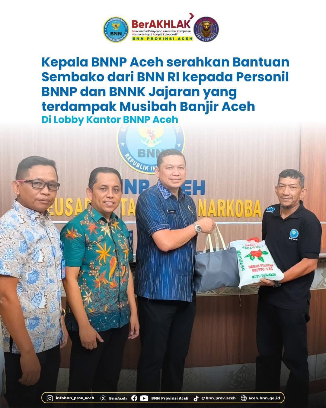 Kepala BNNP Serahkan Bantuan Sembako dari BNN Republik Indonesia kepada Para Personil BNNP dan BNNK Jajaran yang Terdampak Musibah Banjir Aceh
