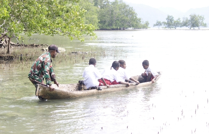 Salah satu personel Satgas TMMD ke-127, Sertu Daniel Ndiken, menunjukkan kepedulian nyata dengan mengantar anak-anak sekolah dari Kampung Marsi menuju Kampung Sisir. Akses pendidikan yang harus ditempuh anak-anak tersebut bukanlah perjalanan biasa. Mereka harus melintasi jalur laut menggunakan perahu atau sampan demi dapat tiba di sekolah dengan selamat.