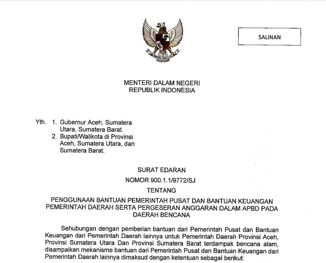 Jakarta, Barometer99.com – Menteri Dalam Negeri (Mendagri) Muhammad Tito Karnavian menerbitkan Surat Edaran (SE) Nomor 900.1.1/9772/SJ tentang Penggunaan Bantuan Pemerintah Pusat dan Bantuan Keuangan Pemerintah Daerah (Pemda) serta Pergeseran Anggaran dalam APBD Daerah Bencana. Surat yang ditujukan kepada kepala daerah di Aceh, Sumatera Utara (Sumut), dan Sumatera Barat (Sumbar) tersebut diteken Mendagri pada Kamis, 11 Desember 2025.