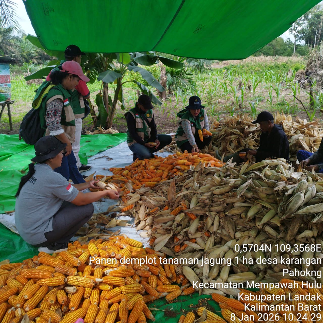 Kegiatan panen perdana tersebut berlangsung pada Kamis, 8 Januari 2026, mulai pukul 10.00 WIB hingga selesai, bertempat di lahan milik BUMDes Desa Karangan. Dari hasil panen tersebut diperoleh produksi jagung sebanyak 4.000 kilogram.