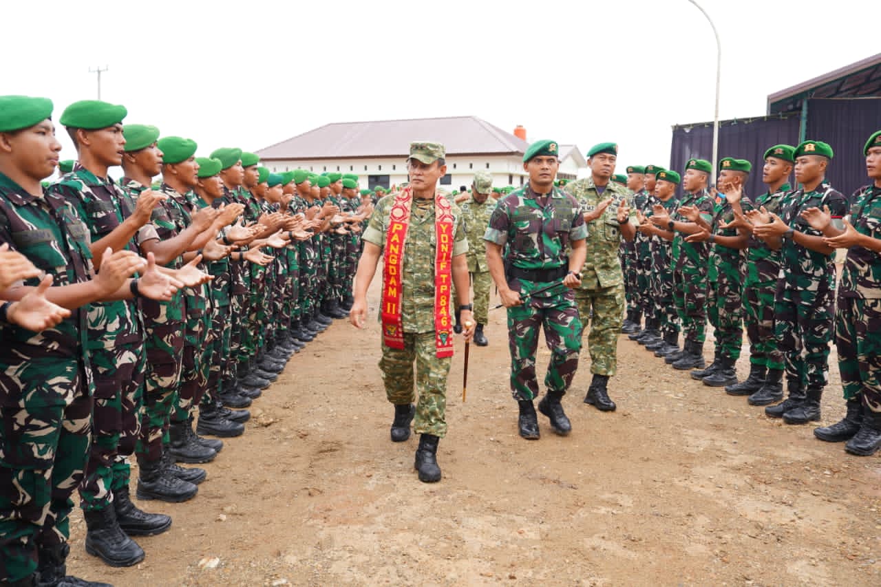 Setibanya di Markas Komando (Mako) Yonif TP 846/KS, Pangdam II/Sriwijaya disambut dengan Laporan Satuan dari Komandan Batalyon TP 846/KS, Letkol Inf Hermanto Pungky Probowo, S.E., M.M. Suasana penuh semangat terlihat dari antusiasme prajurit dalam menyambut kedatangan Pangdam beserta rombongan, yang diawali dengan laporan Pos 1 dan Hormat Jajar dari regu jaga kesatrian.