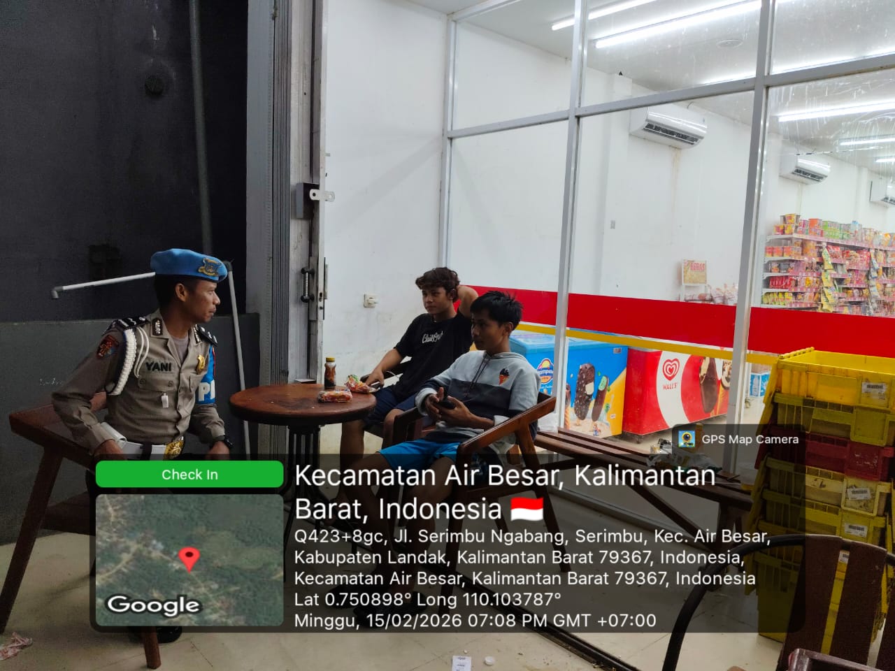 Polsek Air Besar ~ Polres Landak ~ Polda Kalbar, Barometer99.com ~ Minggu malam (15/2/2026), personel Polsek Air Besar melaksanakan patroli malam rutin guna menjaga situasi keamanan dan ketertiban masyarakat (kamtibmas) di wilayah hukumnya. Dalam kegiatan tersebut, polisi menyempatkan diri menemui warga yang sedang duduk santai di depan rumah dan tempat berkumpul warga.