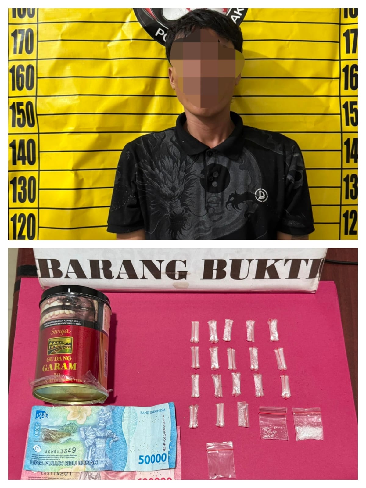 Dan setelah dilakukan penggeledahan badan dan pakaian terduga pelaku S ditemukan di saku celana sebelah kanan nya 1 (satu) buah kaleng rokok surya gudang garam warna merah berisikan : 20 (dua puluh) paket klip plastik transparan berisi Kristal diduga Narkotika jenis shabu dengan berat Bruto 3,41 (tiga koma empat puluh satu) Gram, serta 1 (satu) buah plastik klip transparan kosong, kemudian di saku celana sebelah kiri nya ditemukan uang sejumlah Rp 150.000 (seratus lima puluh ribu rupiah).
