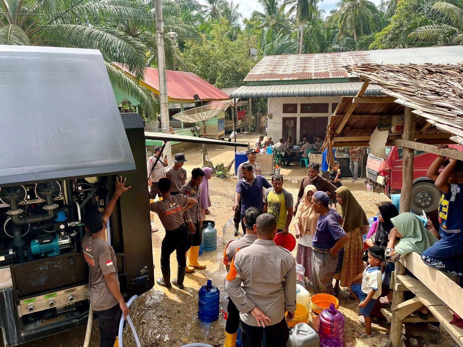 Air bersih yang disalurkan bersumber dari mobil Tangki dan diolah menggunakan Mobil Water Treatment Brimob Polri melalui delapan tahapan filterisasi hingga menghasilkan air siap konsumsi.