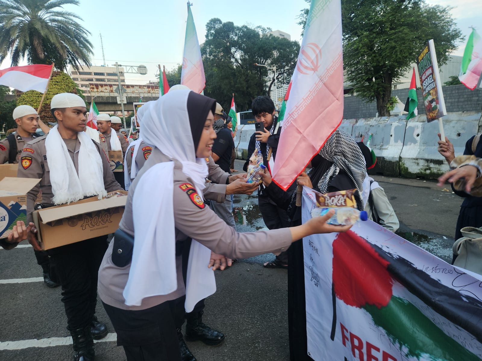 Jakarta, Barometer99.com / Personel Polda Metro Jaya menunjukkan pendekatan humanis saat pelayanan pengamanan aksi unjuk rasa dari Free Palestine Network dengan membagikan snack berupa roti dan air mineral kemasan kepada para peserta aksi yang berlangsung di seberang Kedutaan Besar Amerika Serikat (Kedubes AS), Minggu (8/3/2026) sekitar pukul 17.45 WIB.