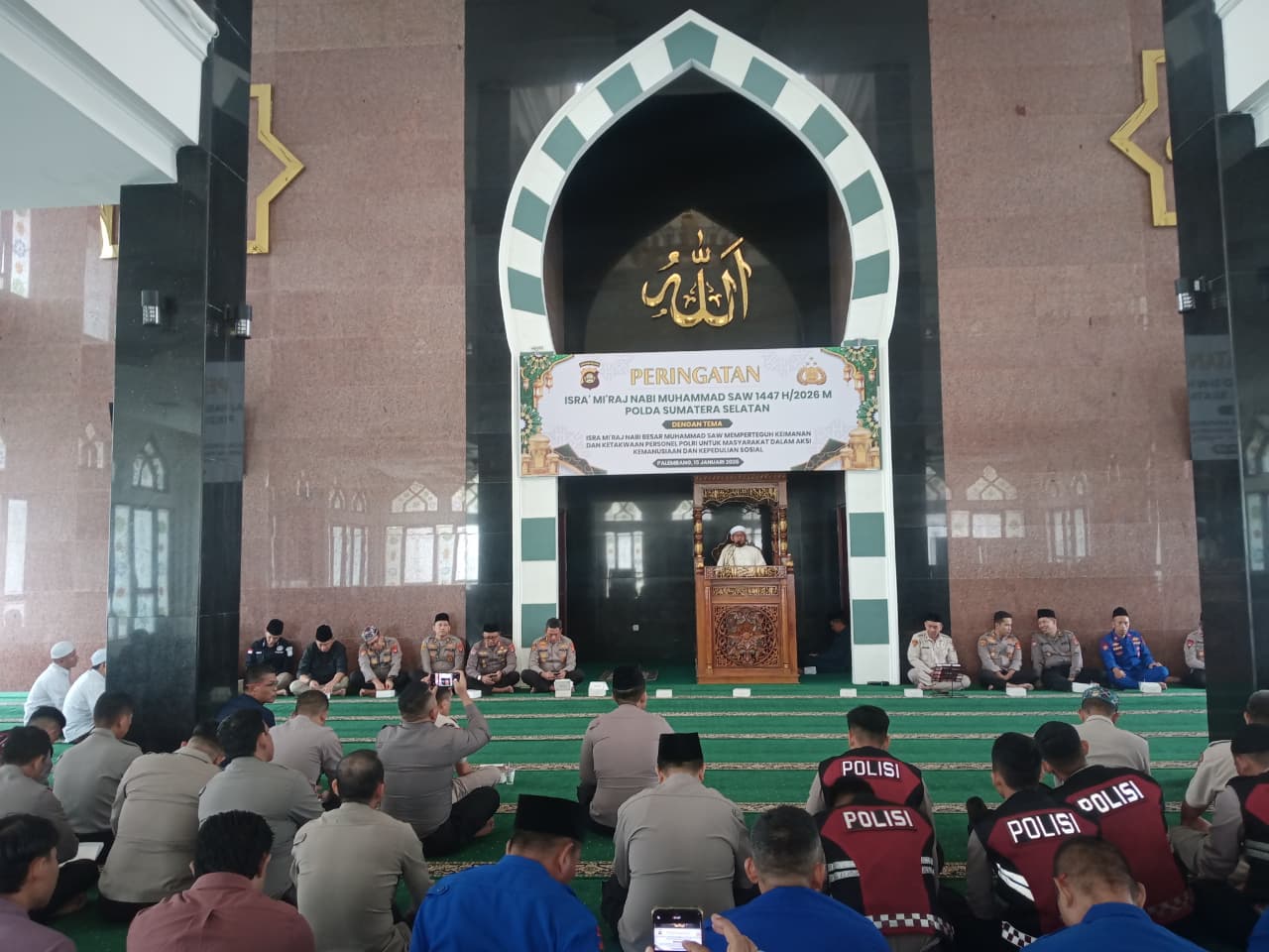 Palembang, Barometer99.com – Kepolisian Daerah Sumatera Selatan ( Polda Sumsel ) menggelar peringatan Isra Miraj Nabi Besar Muhammad SAW Tahun 1447 Hijiriyah di Masjid Assa’adah Mapolda Sumsel, Jalan Jenderal Sudirman Kota Palembang Kamis (15/1/2026).