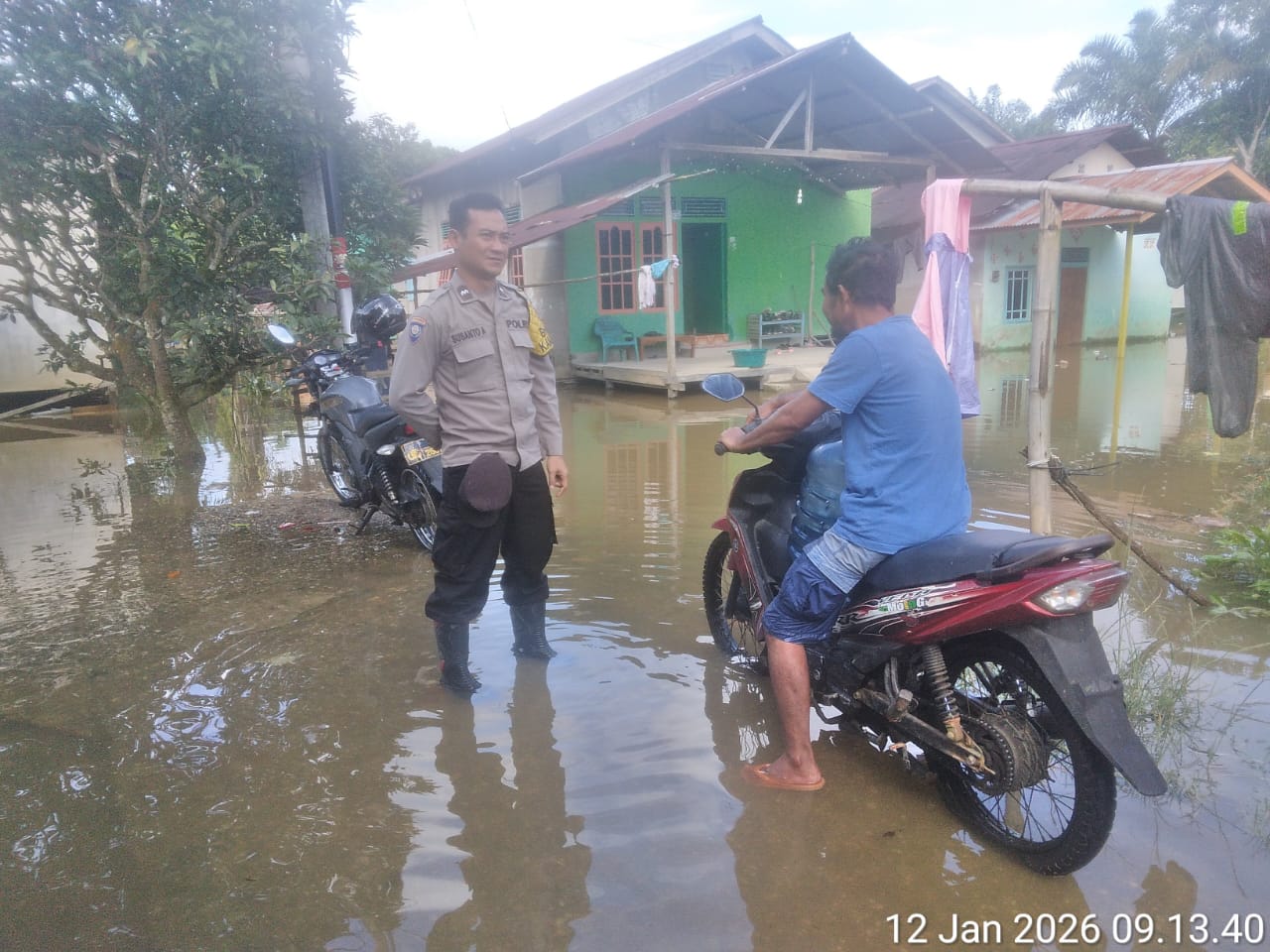 Di Dusun Raiy, genangan air terpantau cukup tinggi, dengan ketinggian air di jalan utama mencapai 70 sentimeter dan di jalan gang hingga 120 sentimeter. Tercatat sebanyak 50 rumah warga terdampak, namun belum ada laporan pengungsian.