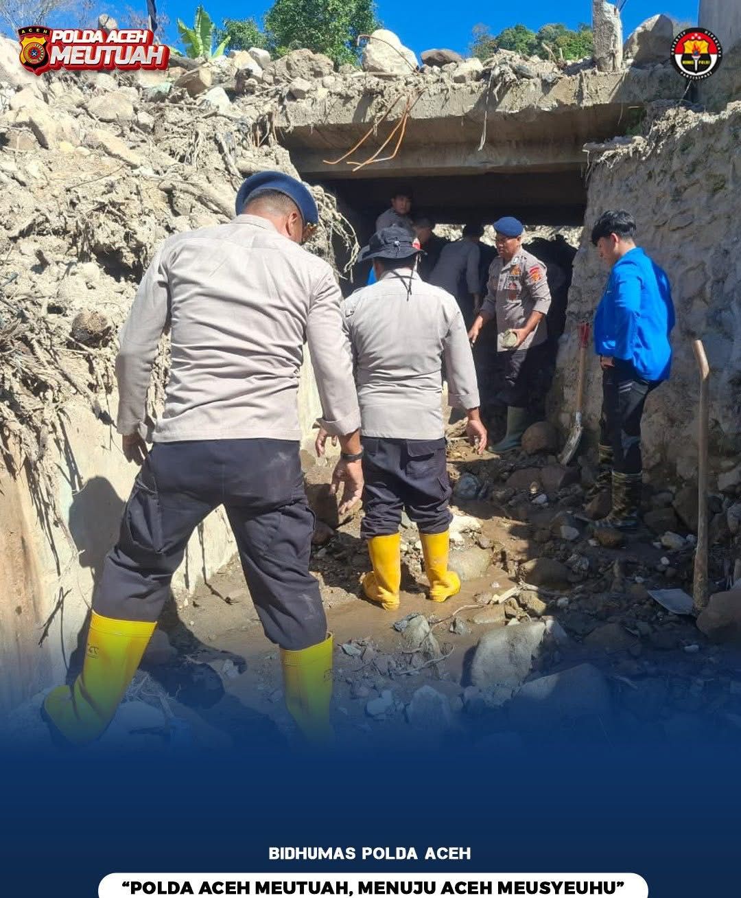 Personel Polsek Silih Nara dan BKO Brimob Bersama Bersihkan Puing-puing Pascabencana di Aceh Tengah