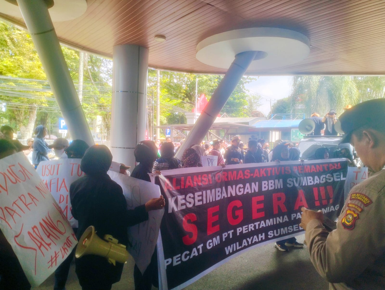 Salah satu massa lain menambahkan, “Sumbagsel adalah salah satu pusat lumbung energi nasional, namun warga Sumsel sangat kesulitan membeli bahan bakar. Apakah minyak di Sumsel sudah habis, atau dimanfaatkan oknum direksi? Kita tahu bahwa akhir-akhir ini ada kasus penyalahgunaan jabatan pada direksi Pertamina, dan kami menuntut penjelasan yang rinci dan transparan.”