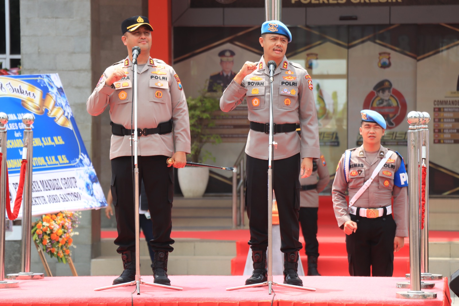Untuk terakhir kalinya, Kapolres lama AKBP Rovan Richard Mahenu melewati barisan pedang pora menuju gerbang Mapolres Gresik. Didampingi istri, ia berpamitan dengan menyalami seluruh personel, mulai dari perwira hingga bintara, sebagai wujud penghormatan, rasa terima kasih, serta permohonan maaf.