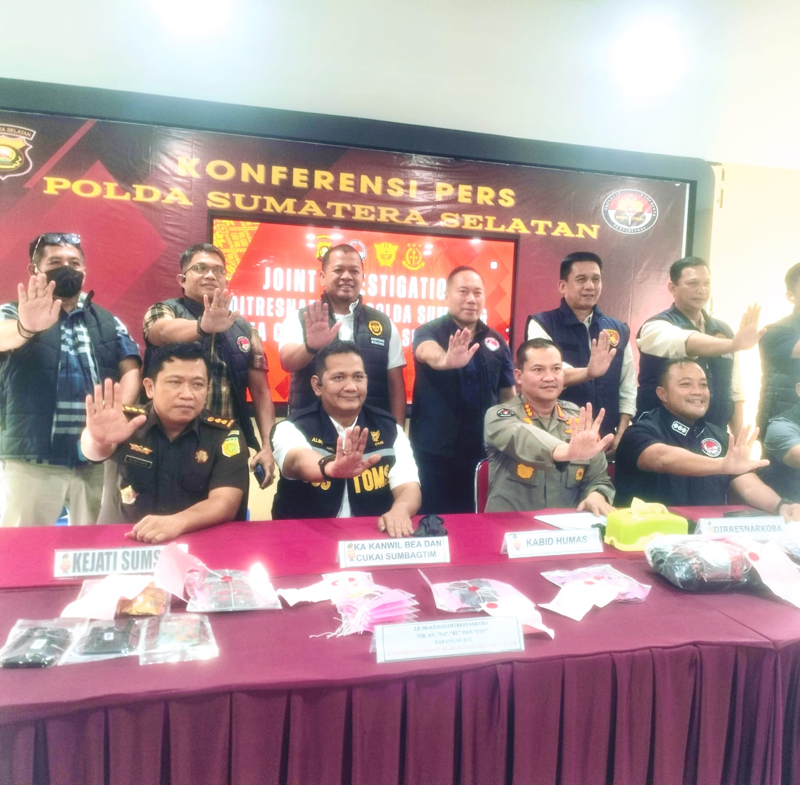 Konferensi pers dihadiri jajaran Polda Sumsel, perwakilan Kanwil Bea dan Cukai Sumbagtim, serta Kejaksaan Tinggi Sumsel.