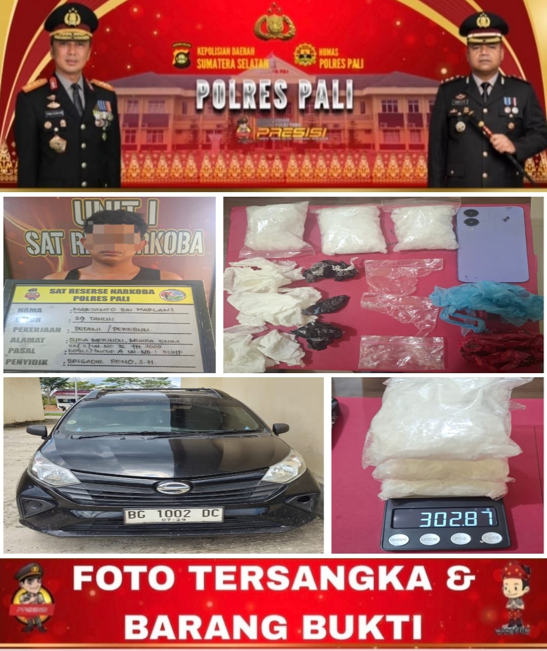 Kapolres PALI melalui Kasat Resnarkoba AKP Dedy Suandy, S.H., menjelaskan bahwa penangkapan dilakukan pada Kamis malam, 23 April 2026, di jalan lintas Desa Tempirai, Kecamatan Penukal Utara, Kabupaten PALI. Tersangka merupakan warga Desa Suka Merindu, Kecamatan Sungai Rotan, Kabupaten Muara Enim.