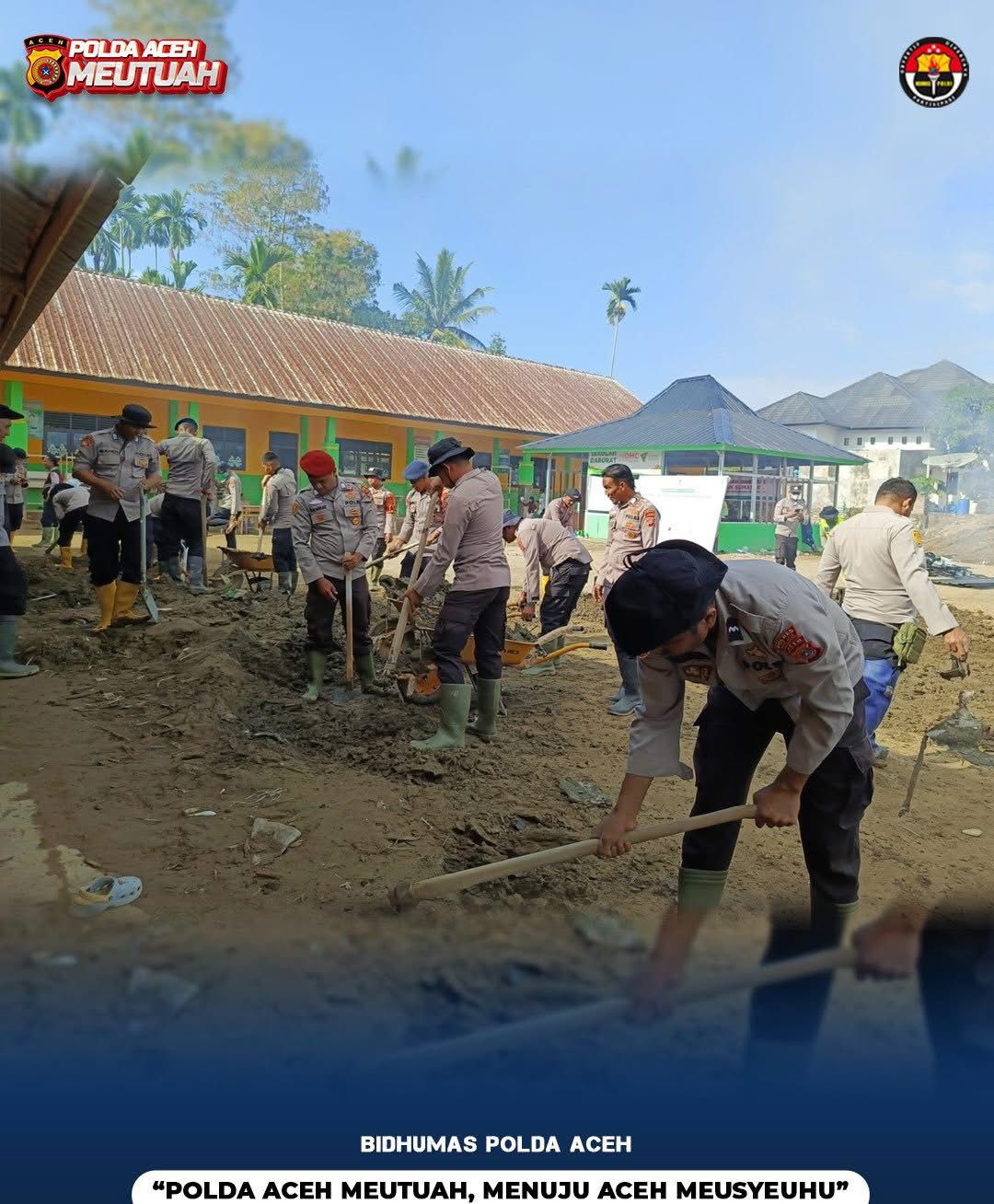 Kapolres Pidie Jaya AKBP Ahmad Faisal Pasaribu, melalui Kasi Humas Polres Pidie Jaya AKP Mahruzar Hariadi, menyampaikan bahwa kegiatan ini merupakan bagian dari upaya Polri untuk mempercepat pemulihan pascabencana banjir, terutama pada fasilitas umum dan sarana pendidikan.