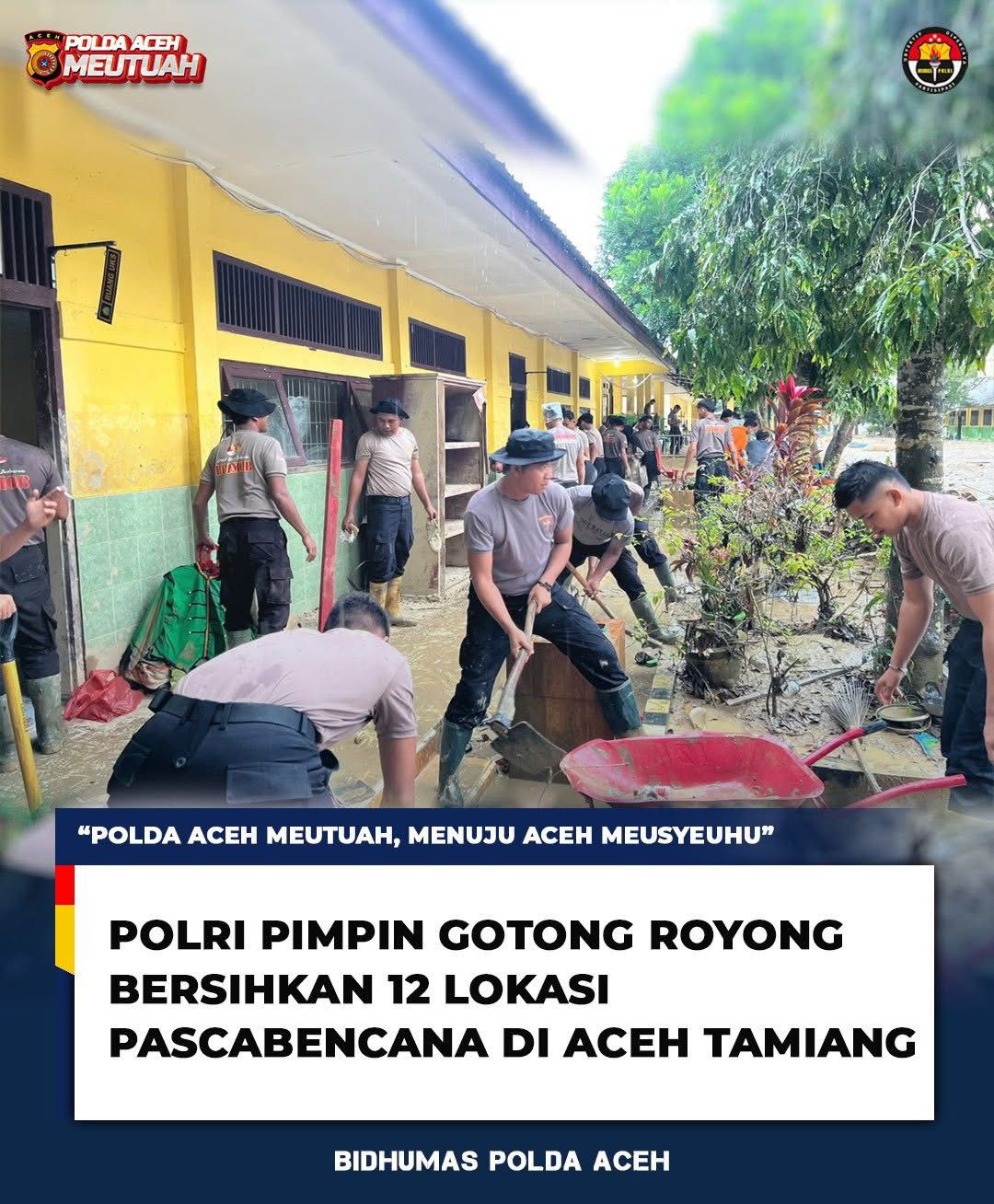 Kabid Humas Polda Aceh, Kombes Pol. Joko Krisdiyanto, S.I.K., dalam keterangannya pada Jumat (9/1/2026) menyampaikan bahwa lokasi yang dibersihkan pada hari itu meliputi enam sekolah, satu klinik Polres, satu rumah sakit umum daerah (RSUD), satu masjid, satu ruas jalan, satu kantor BNNK, dan satu Puskesmas Pembantu.