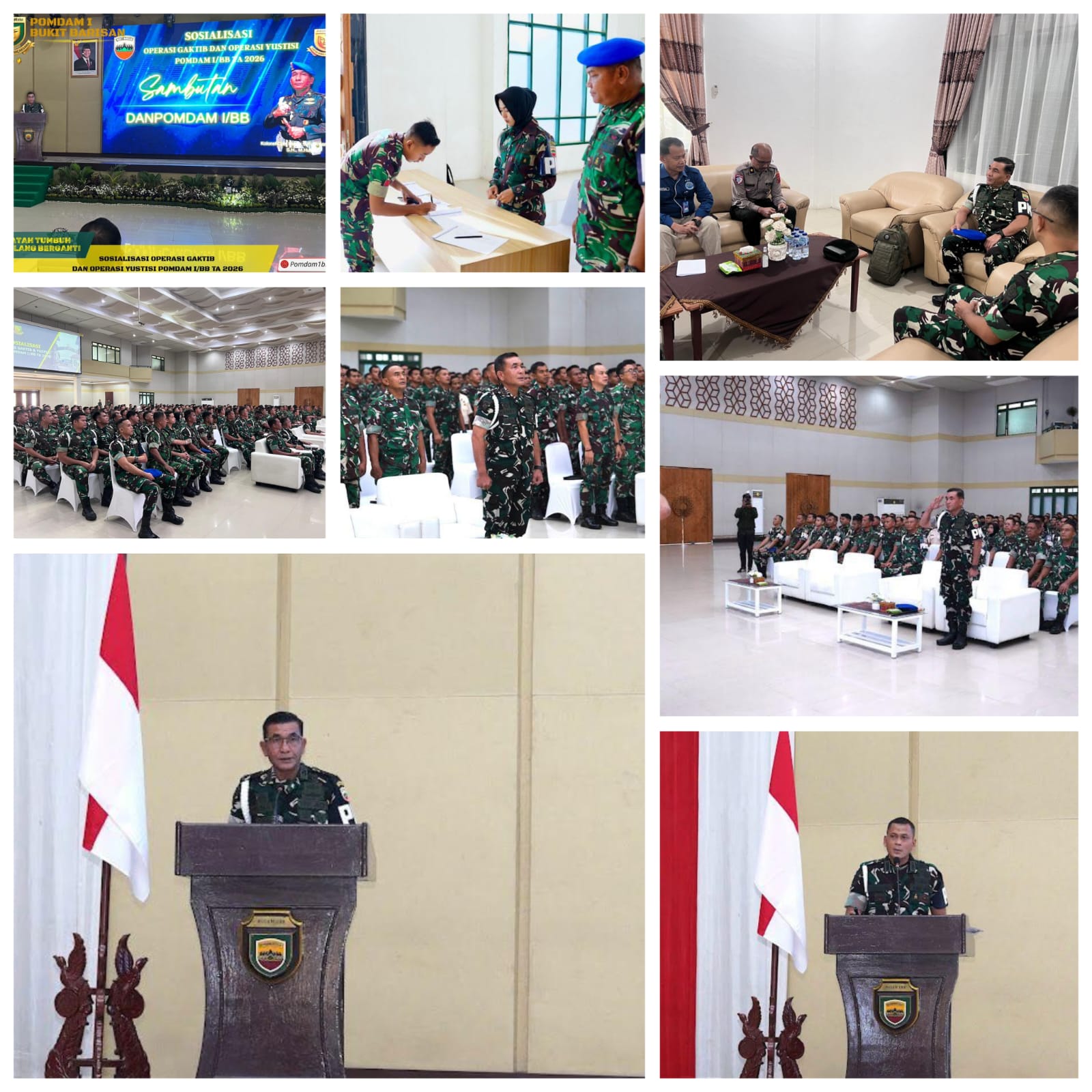 Medan, Barometer99.com – Danpomdam I/BB Kolonel Cpm Henry S.P Simanjuntak S.H M.Hum pada Kamis (5/3/2026) melakukan sosialisasi Operasi Gaktib ” Waspada Wira Piso ” dan Operasi Yustisi ” Citra Wira Piso ” TA 2026 kepada para prajurit di jajaran Kodam I/BB bertempat di Balai Prajurit Makodam I/BB Jalan Gatot Subroto No KM 7 Kota Medan.