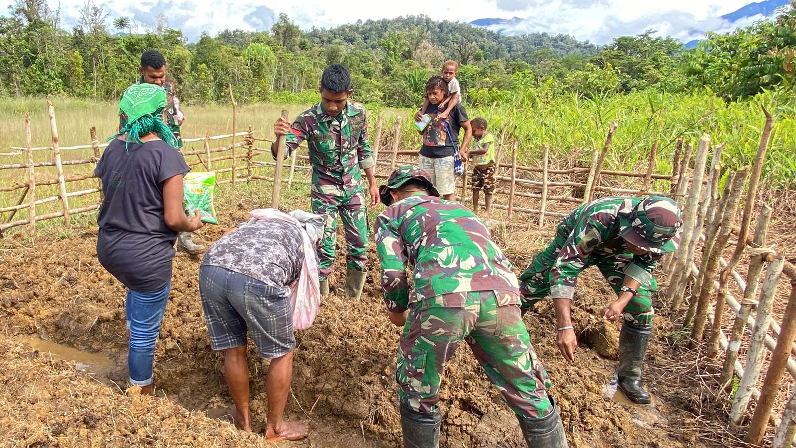 Gotong royong dimulai dari pembersihan lahan, penggemburan tanah, penataan bedengan, hingga penanaman komoditas sayuran cepat panen sesuai kondisi setempat. Personel Pos Denom turut memberikan pendampingan teknis sederhana, seperti cara memilih bibit, jarak tanam, pemupukan organik, penyiraman, serta langkah pencegahan hama yang mudah diterapkan agar hasil kebun lebih maksimal.