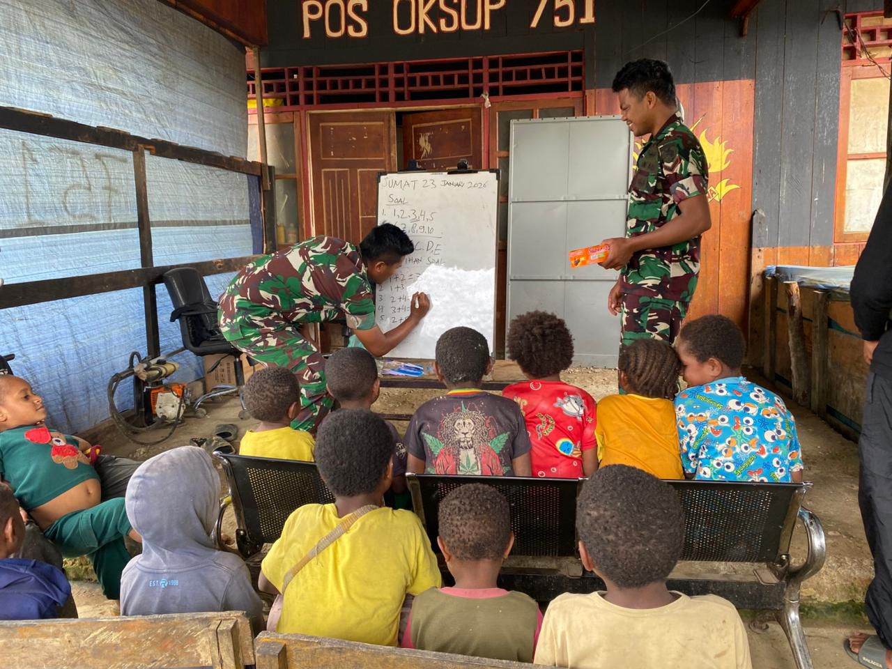 Oksop, Pegunungan Bintang, Barometer99.com — Pos Oksop Satgas Pamtas RI–PNG Yonif 751/Vira Jaya Sakti (VJS) melaksanakan kegiatan pembinaan teritorial berupa belajar calistung (membaca, menulis, dan berhitung) di pos. Kegiatan ini bertujuan menanamkan kemampuan dasar pendidikan sejak dini agar ke depan semakin banyak masyarakat Papua, khususnya generasi muda, memiliki bekal literasi dan numerasi yang kuat untuk menunjang masa depan. (Jumat,23/1/2026).