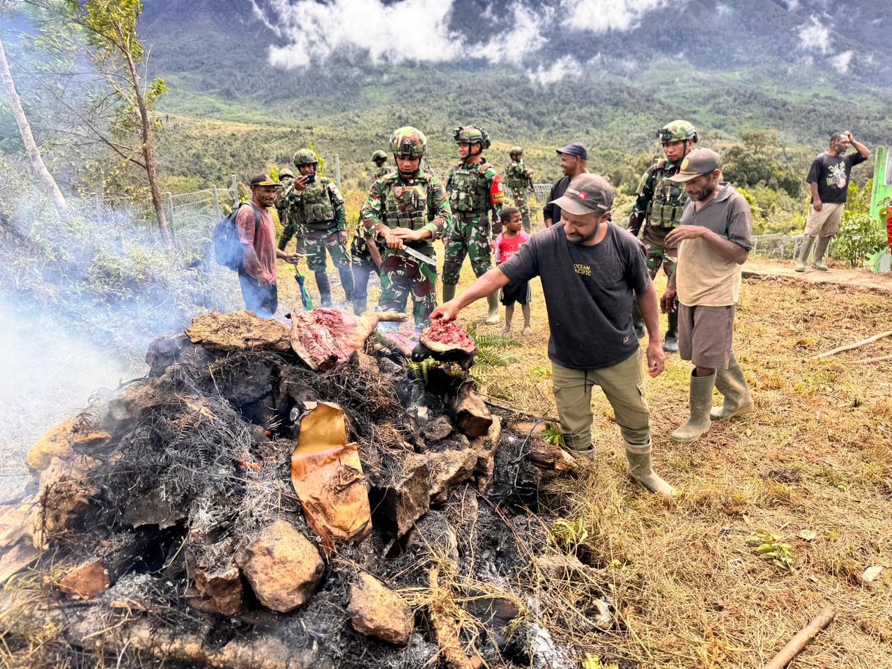 Kebersamaan semakin terasa saat seluruh proses dikerjakan tanpa sekat dan tanpa jarak. Prajurit dan masyarakat tampak menyatu dalam setiap tahapan kegiatan, saling membantu dan bekerja sama demi menyukseskan tradisi bakar batu yang menjadi bagian penting dari budaya masyarakat Pegunungan Bintang.