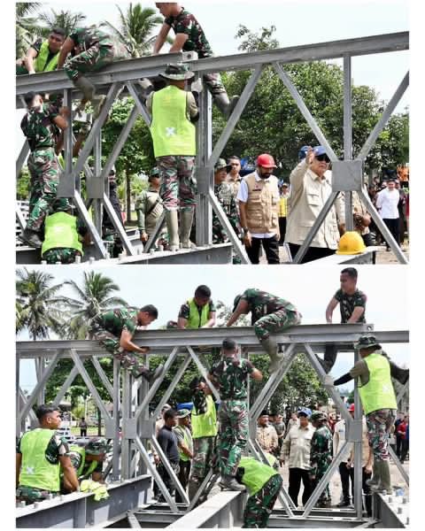 Setibanya di lokasi, Presiden Prabowo langsung meninjau pembangunan Jembatan Bailey Teupin Mane, ruas vital penghubung Bireuen-Takengon di Kabupaten Bireuen. Jembatan sementara ini, akan segera bisa digunakan dalam 2-3 hari.