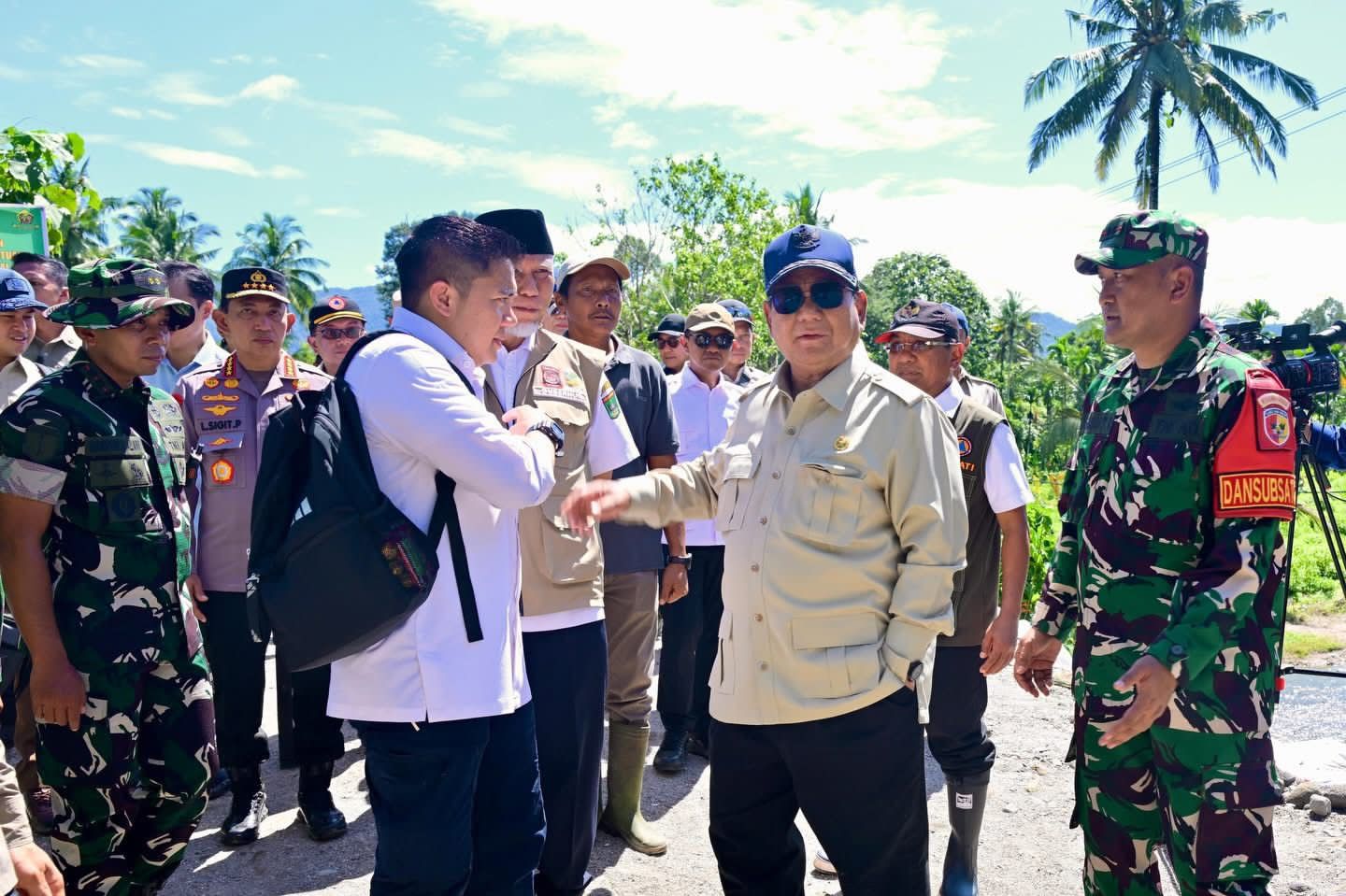 Tiba di lokasi, Presiden Prabowo langsung meninjau pembangunan Jembatan Bailey Padang Mantuang yang merupakan akses penghubung Jalan Padang Mantuang di Nagari Kayu Tanam, Kecamatan 2×11 Kayu Tanam, yang terdampak akibat bencana..