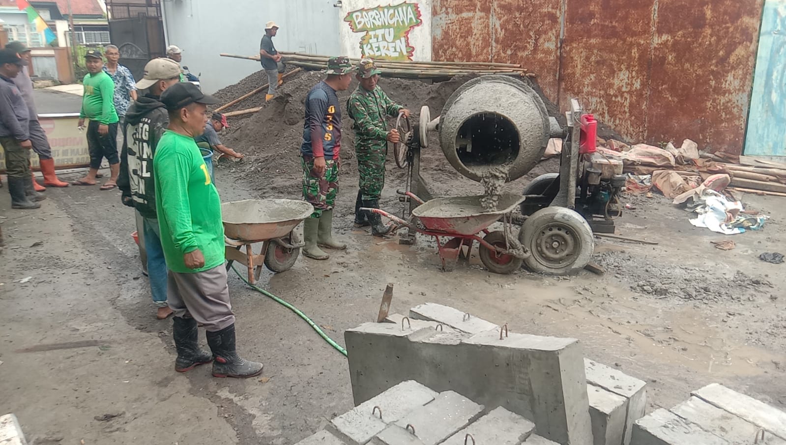 Dalam Sasaran Perbaikan Saluran Air Satgas TMMD yang dipimpin langsung oleh Danramil 03 Serengan Kodim 0735 Surakarta Kapten Cba Tri Rusman Prasetyo S.Sos memanfaatkan mesin pengaduk beton (Molen Beton) untuk mempercepat pekerjaan. Wujud Kehangatan TNI dan Rakyat “Ada 1 unit mesin pengaduk semen (molen) yang digunakan oleh Satgas TMMD dalam kegiatan pengecoran jalan ini” jelas Kapten Cba Tri Rusman P