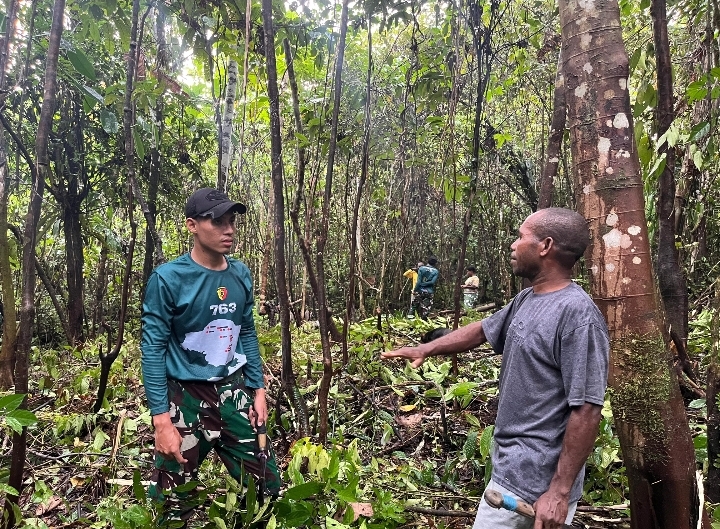 Afkrem, Barometer99.com – Satgas Pamtas RI-PNG Kewilayahan Yonif 763/SBA Pos Afkrem bersama masyarakat melaksanakan kegiatan Pembinaan Teritorial Pembersihan Kebun Warga di Kp. Afkrem.