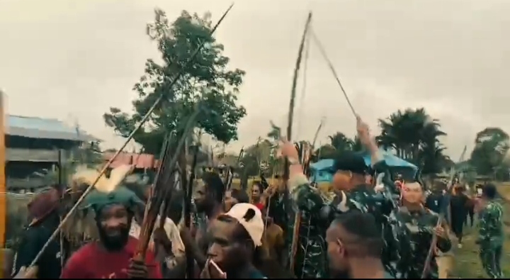 Papua, Barometer99.com – Satgas Yonif 123/Rajawali bersama masyarakat pedalaman Papua melaksanakan Tarian Busur (Hasam) Suku Koroway sebagai simbol dimulainya kehidupan baru serta pembersihan diri dari roh-roh jahat menurut kepercayaan adat.