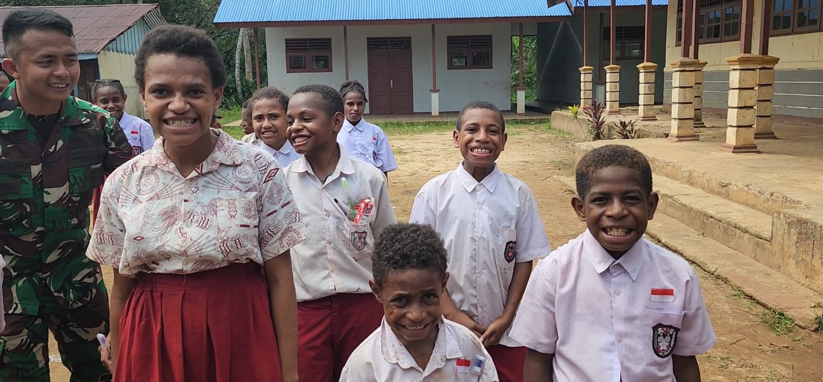 Para anggota Pos Bade dengan penuh keceriaan menggelar kegiatan edukasi kesehatan gigi dan mulut kepada anak-anak Sekolah Dasar (SD) Mememu di Distrik Edera. Gak cuma sekadar kasih tahu, tapi mereka langsung praktik mengajarkan cara menyikat gigi yang benar, Dengan sabar dan ramah, personel Pos Bade mendemonstrasikan teknik menyikat gigi yang tepat, mulai dari gerakan memutar hingga menjangkau seluruh permukaan gigi. Anak-anak SD pun antusias mengikuti setiap langkahnya.