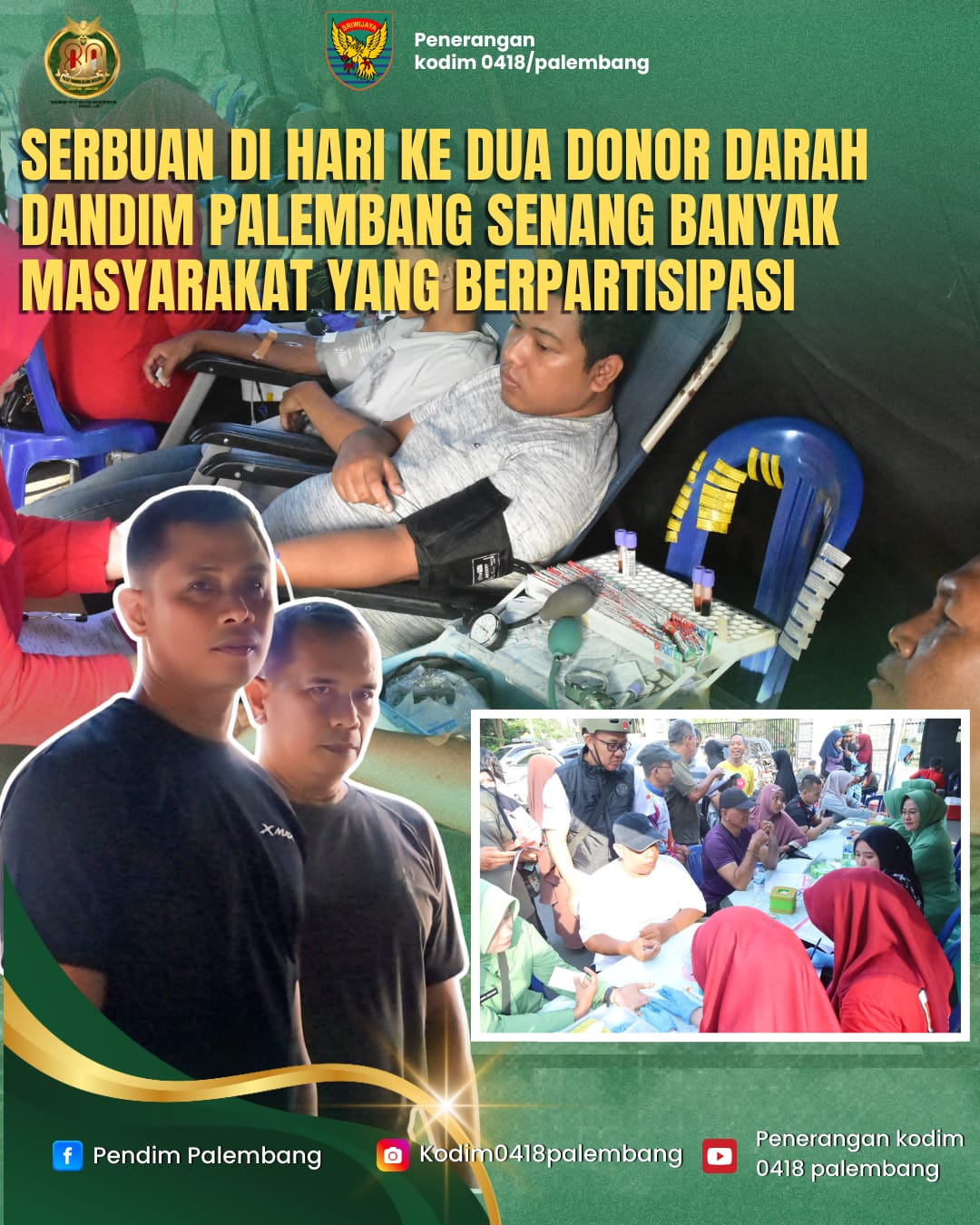 Pada pelaksanaan hari kedua, sebanyak 75 kantong darah berhasil dikumpulkan dan diserahkan kepada PMI Kota Palembang. Seluruh rangkaian kegiatan berjalan tertib, aman, dan lancar dengan tetap mengutamakan prosedur kesehatan.