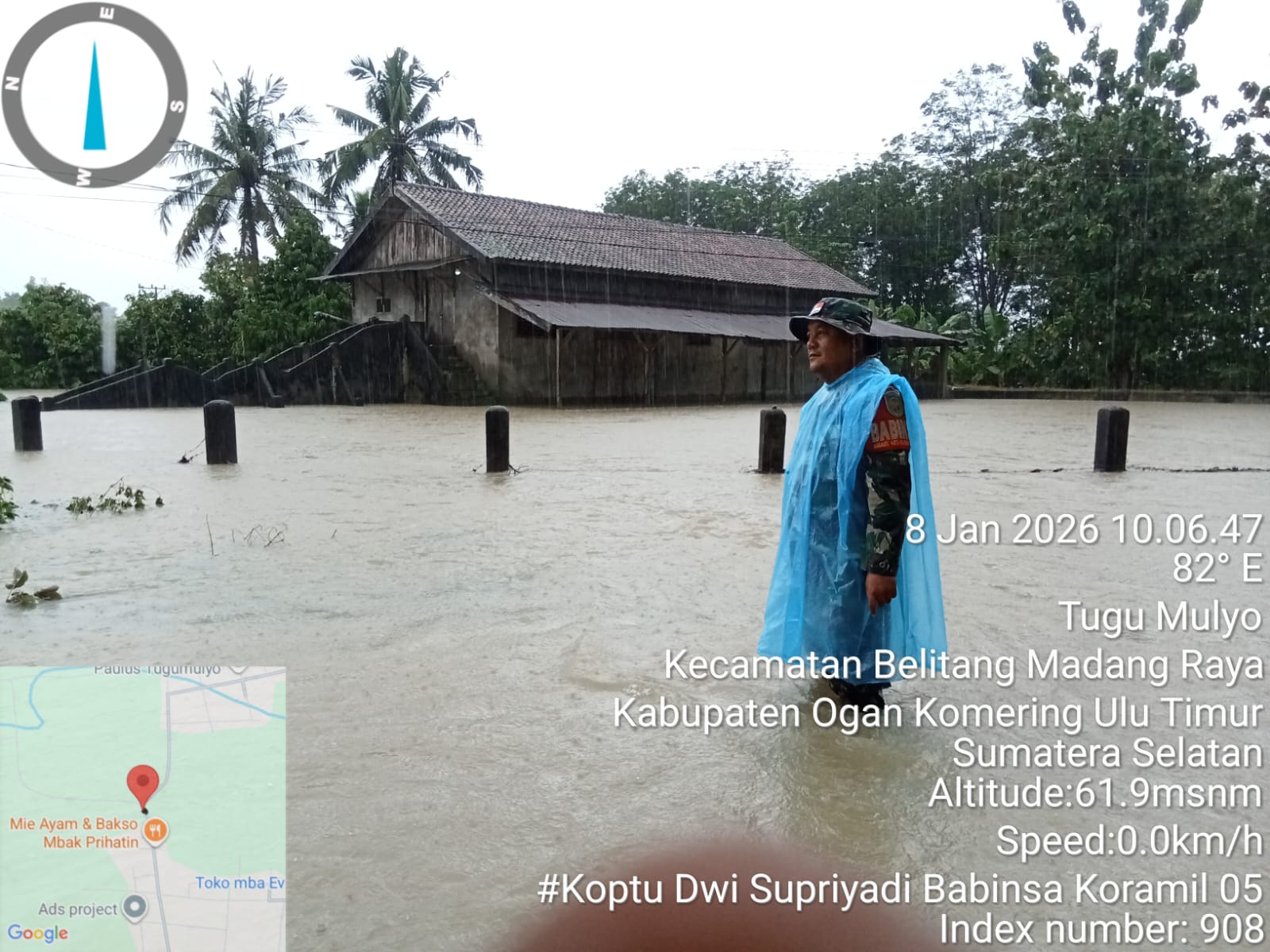 Sumsel, Barometer99.com – Babinsa Desa Karang Jadi, Sertu Iwan Gunarto dari Koramil 403-04/Belitang Kodim 0403/OKU, berhasil mengevakuasi masyarakat yang terjebak di dalam mobil akibat terseret arus banjir di Desa Karang Jadi, Kecamatan Belitang III, Kabupaten OKU Timur, pada Kamis (08/01/2026)._